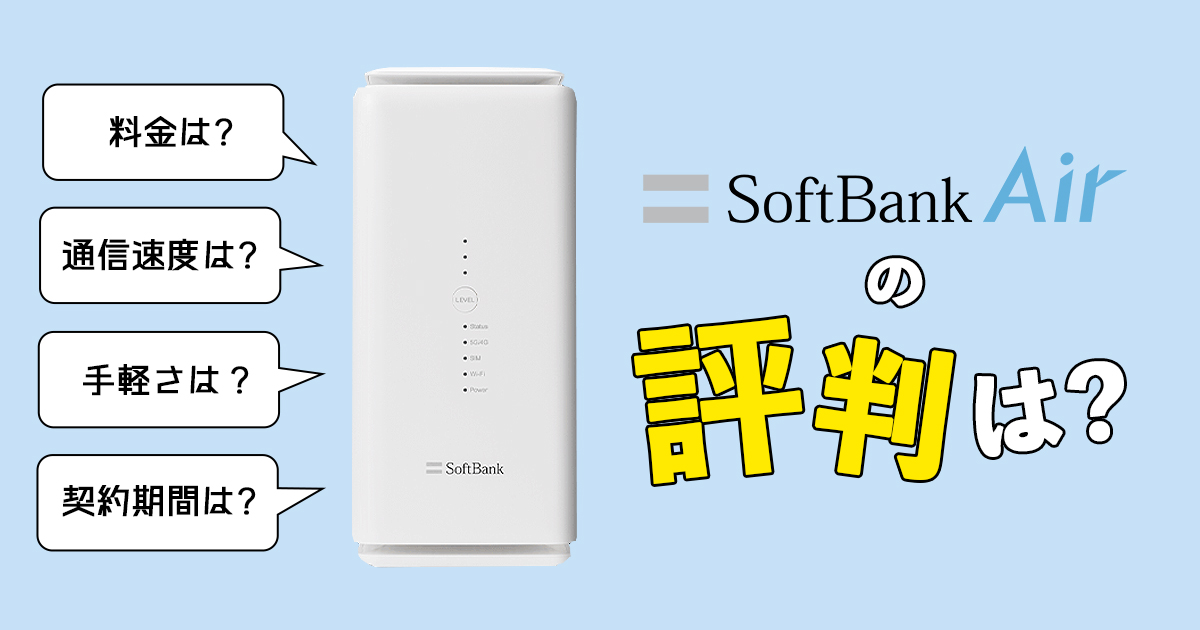 ソフトバンクエアーの評判はさまざまで、主に手軽さ・料金・通信速度・契約期間と違約金等について見られます。し正しく参考になるよう、5G対応端末の導入やサービス内容の進歩を踏まえ、実際のソフトバンクエアーを詳しく検証しました。