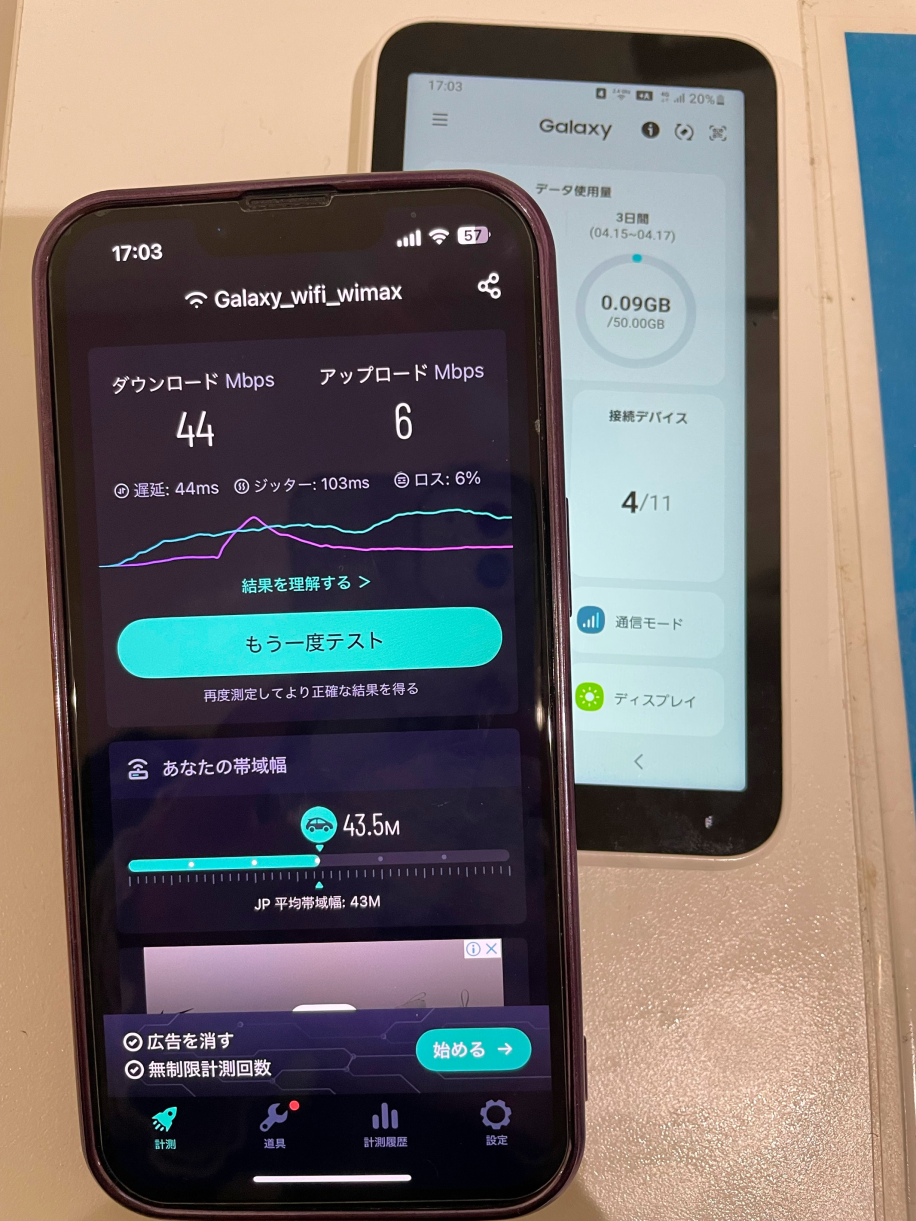 Galaxy 5G Mobile Wi-Fiの速度チェック