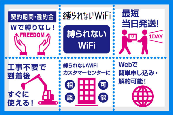 縛られないWiFiに似た“縛りなしWiFi”といったWiFiがありますが、全くの別物ですので、注意が必要です。